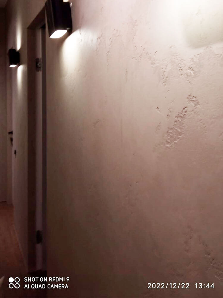 Покрытие Italica Intonaco Travertino КМ0 в сочетание с защитным лаком Lacca Protettiva 7 имеет крепкое сцепление с поверхностью стен и прослужит долгое время. За счет натурального облика и минималистичного оформление срок актуальности не иссекаем.