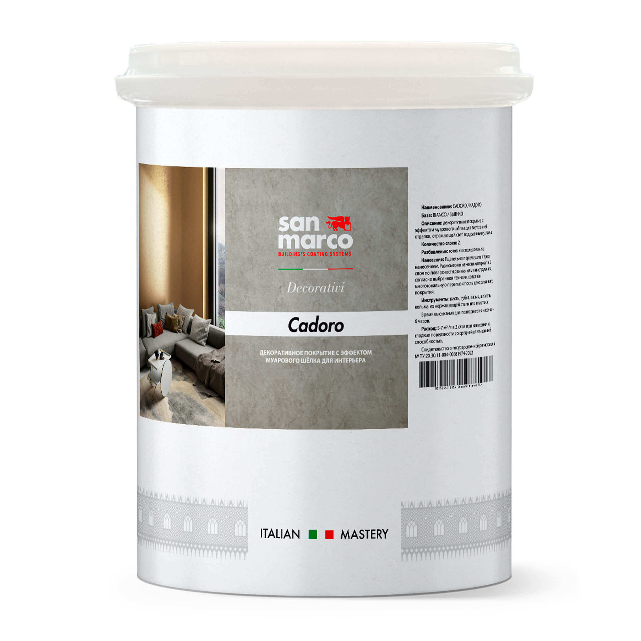 San Marco CADORO – это изысканное декоративное покрытие для внутренних работ, создающее утонченный рисунок, напоминающий мягкий переливчатый муаровый шелк. Благодаря богатству оттенков и разнообразию техник нанесения, материал позволяет воплощать уникальные дизайнерские задумки и придавать стенам особый шарм, подчеркиваемый игрой света.