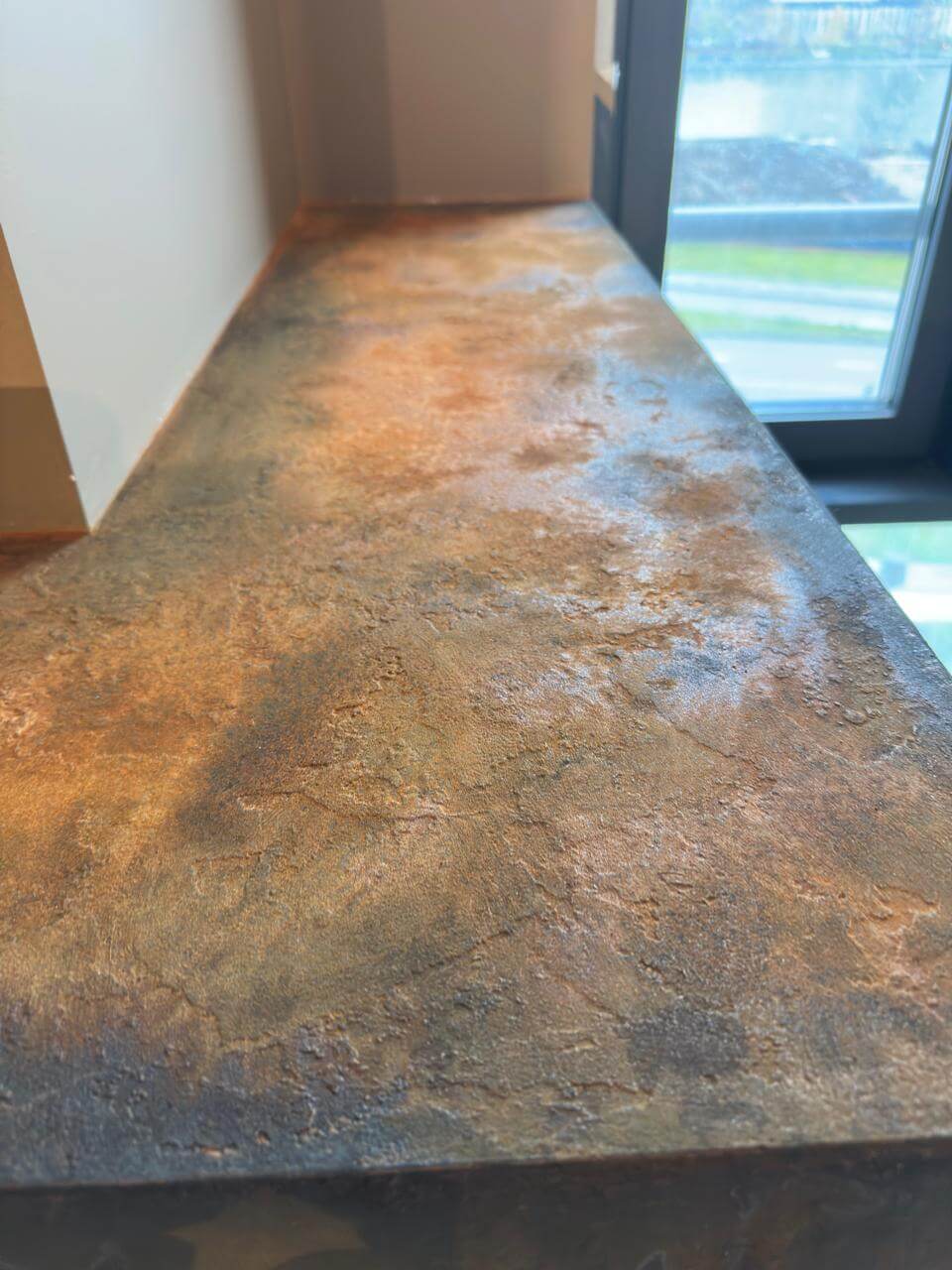 Фальшкамин из декоративной штукатурки под эффект металла — уникальное сочетание благородной текстуры травертина и состаренного металла. Основа выполнена из Marmo Travertino 500, а металлический эффект достигнут с помощью декоративной краски Ferro и активатора коррозии Ironic, создающего эффект натуральной патины. Результат — элегантный, долговечный и визуально выразительный элемент интерьера, который станет центром любой гостиной.