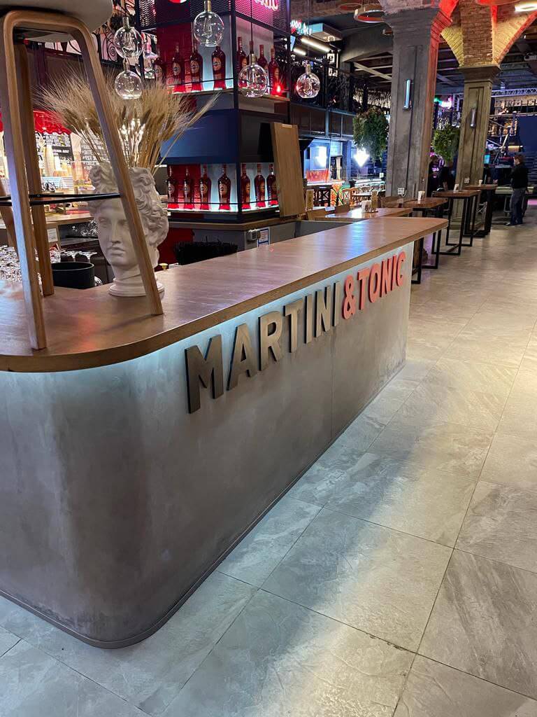 Оформление барной стойки декоративной штукатуркой Italica Marmo Travertino Fine с мраморной крошкой и минеральными компонентами. Данным материалом можно создать эффект каменного покрытия, травертина или известняка. Для защитного слоя использовался лак PU2, который делает проект прочным и долговечным. Сочетание двух материалов делают поверхность надежной, устойчивой к влаге и уборке с моющими средствами. Легко поддается реставрации при необходимости.