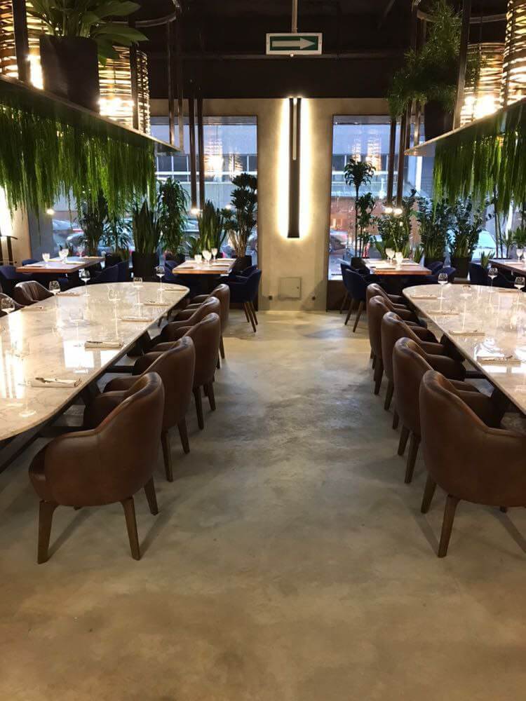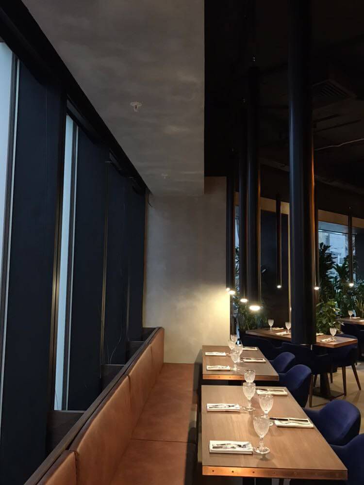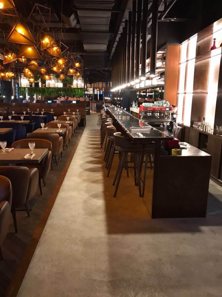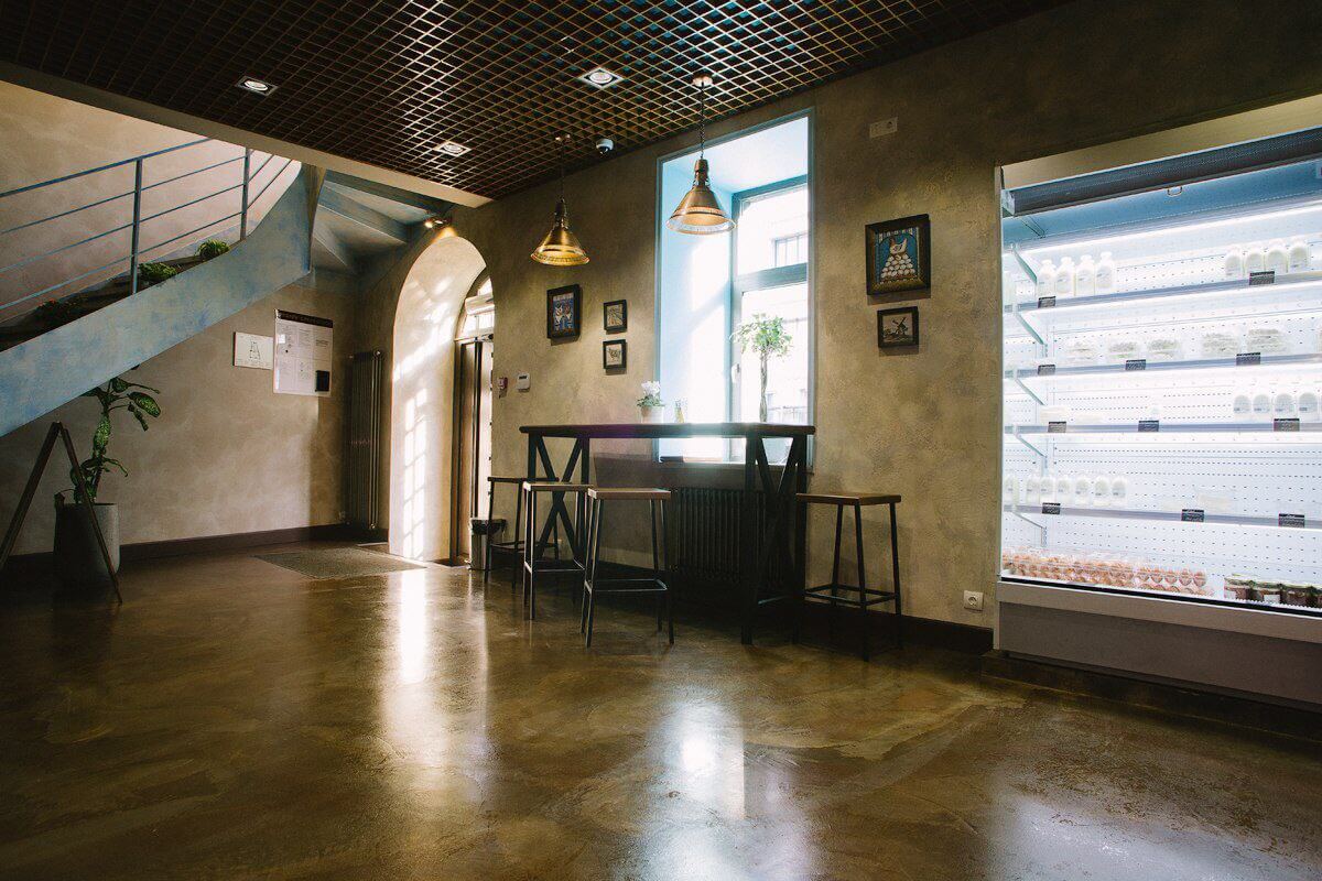 Оформление ресторана декоративной штукатуркой Italica Super Cemento с эффектом микроцемента. В сочетании с полуматовый лаком Lacca Estremo Super, который создает суперпрочное покрытие. Визуально результат смотрится эффектно, современно и стильно. Скомбинированные материалы устойчивы к истиранию при эксплуатации, к влажной уборке с моющими средства даже с щелочным составом. При эксплуатационных повреждениях легко и просто поддается реставрации и косметическому ремонту.