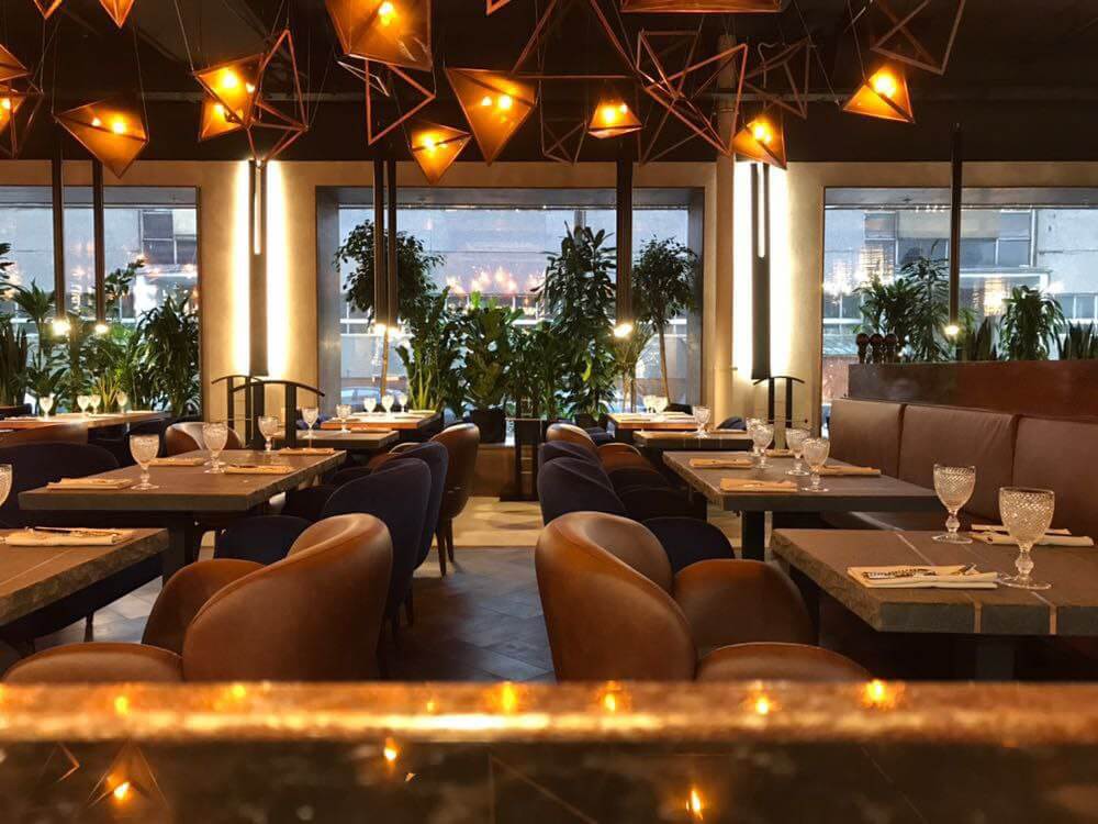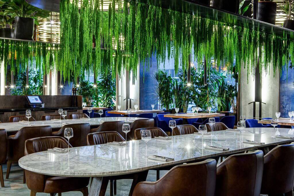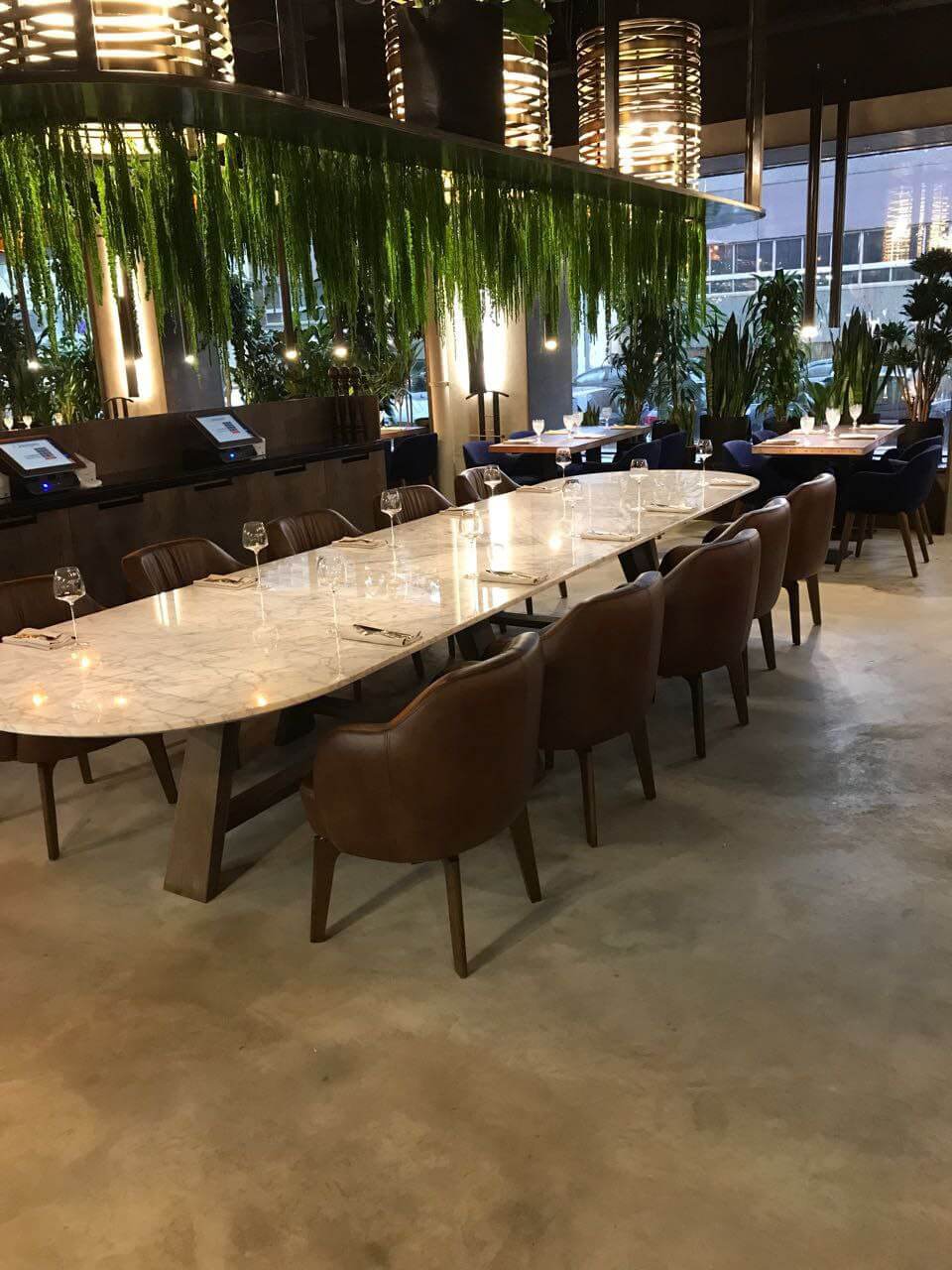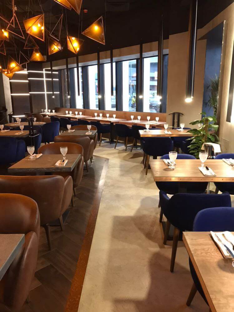 Оформление ресторана декоративной штукатуркой Italica Super Cemento с эффектом микроцемента. В сочетании с полуматовый лаком Lacca Estremo Super, который создает суперпрочное покрытие. Визуально результат смотрится эффектно, современно и стильно. Скомбинированные материалы устойчивы к истиранию при эксплуатации, к влажной уборке с моющими средства даже с щелочным составом. При эксплуатационных повреждениях легко и просто поддается реставрации и косметическому ремонту.