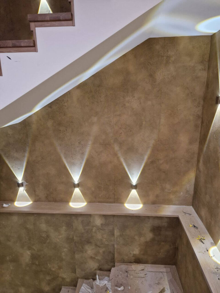 Проект с многоэтапной декоративной отделкой, выполненной на основе фактур травертина Italica Travertino 1000 и Italica Marmo Travertino. Поверхность дополнена металлическим эффектом Italica Metallico Bronze, замшевым слоем Italica Gradiente Palazzo 195 и финишным защитным лаком. Такое сочетание создает глубокий рельеф, сложную игру оттенков и выразительную фактуру, которая по разному раскрывается при освещении.